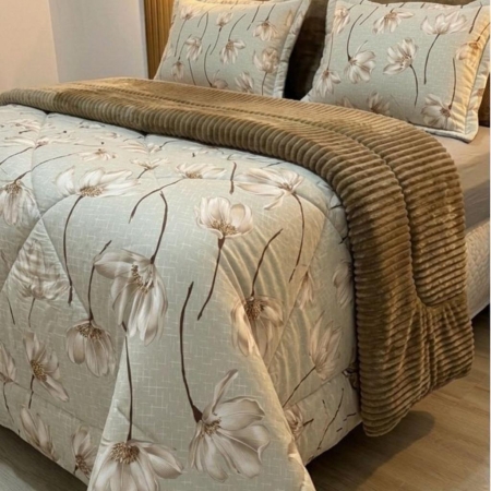 • Kit Coberdrom Malha com Plush Flor Bege Queen 2,40×2,60